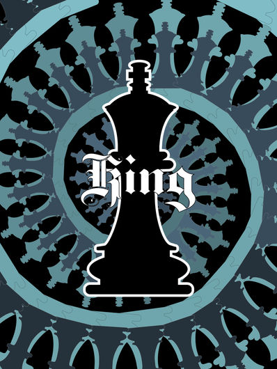 For the Queen, I wanted to reference the Queen of Hearts with the pink color palette. The composition was tricky because the Queen is the most powerful piece in chess and I wanted to find a design that represented that power, presence, and command. I attempted to create a crown around the main queen, and played around with reflections along the bottom. I also have two queens protecting a 3rd smaller one along the top to reference how the Queen protects the king throughout Chess.